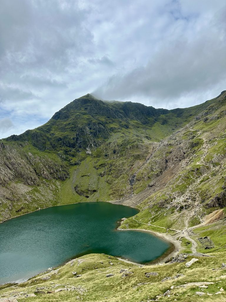 As I gained height, the views expanded dramatically. To my right, the jagged, knife-edge ridge of Crib Goch presented a striking silhouette against the sky, while ahead and to the left, the summit of Snowdon loomed, shrouded in light cloud. The anticipation of those famous 360-degree views kept me motivated, and I hoped the mist would clear in time for my arrival at the top. The next segment of the path was more forgiving, a brief plateau with a gentle gradient allowed for some running, and I seized the opportunity to stretch out my legs, making up time before the final push.