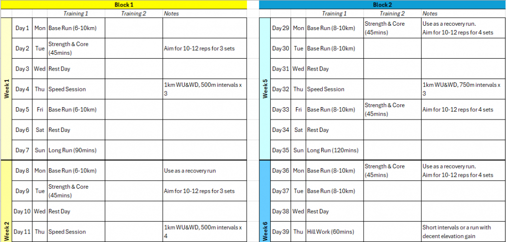 This basic plan will be split into 3 blocks with each block consisting of 4 weeks, with the final week of the block being a cutback week where you will still train, but with less intensity and more focus on recovery and resetting the body and mind. Stretching is recommended every day, preferably pre and post run. But as a minimum, suggested every day on waking up.
