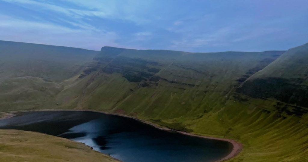 I pushed towards the ridge and the dawn light was now settling in as I hit the ridgeline of the Carmarthen Fans. I could see other runners along the ridgeline as I moved well along it, taking in the stunning early morning views. I hit the summit of Fan Brycheiniog (802m), one of the highest peaks in the western Brecon Beacons and the last big climb of the race. I passed the Llyn y Fan Fawr lake, a scenic glacial lake nestled beneath the cliffs and bumped into the Race Director, Laura who was trying to get some sleep. We had a quick catch up, I didn’t know it was her birthday until after the race. So happy birthday Laura! What a way to spend your birthday morning.